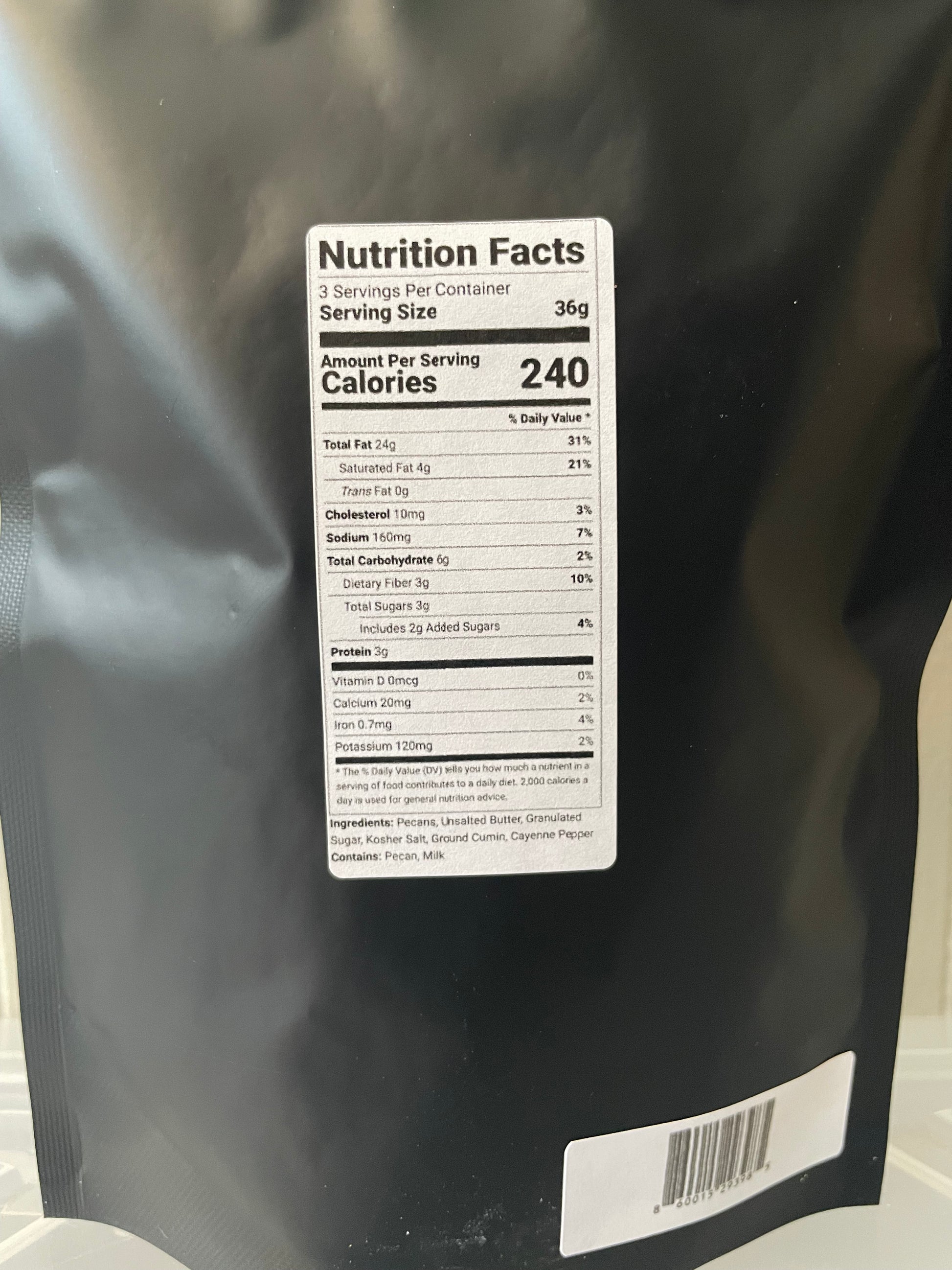 Ingredients: Pecans, Sugar, Butter, Kosher Salt, Cumin, Cayenne Pepper